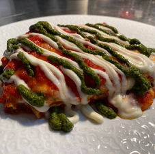 Rinderhackfleisch - Tomatensoße - Bechamelcreme - Basilikumcreme